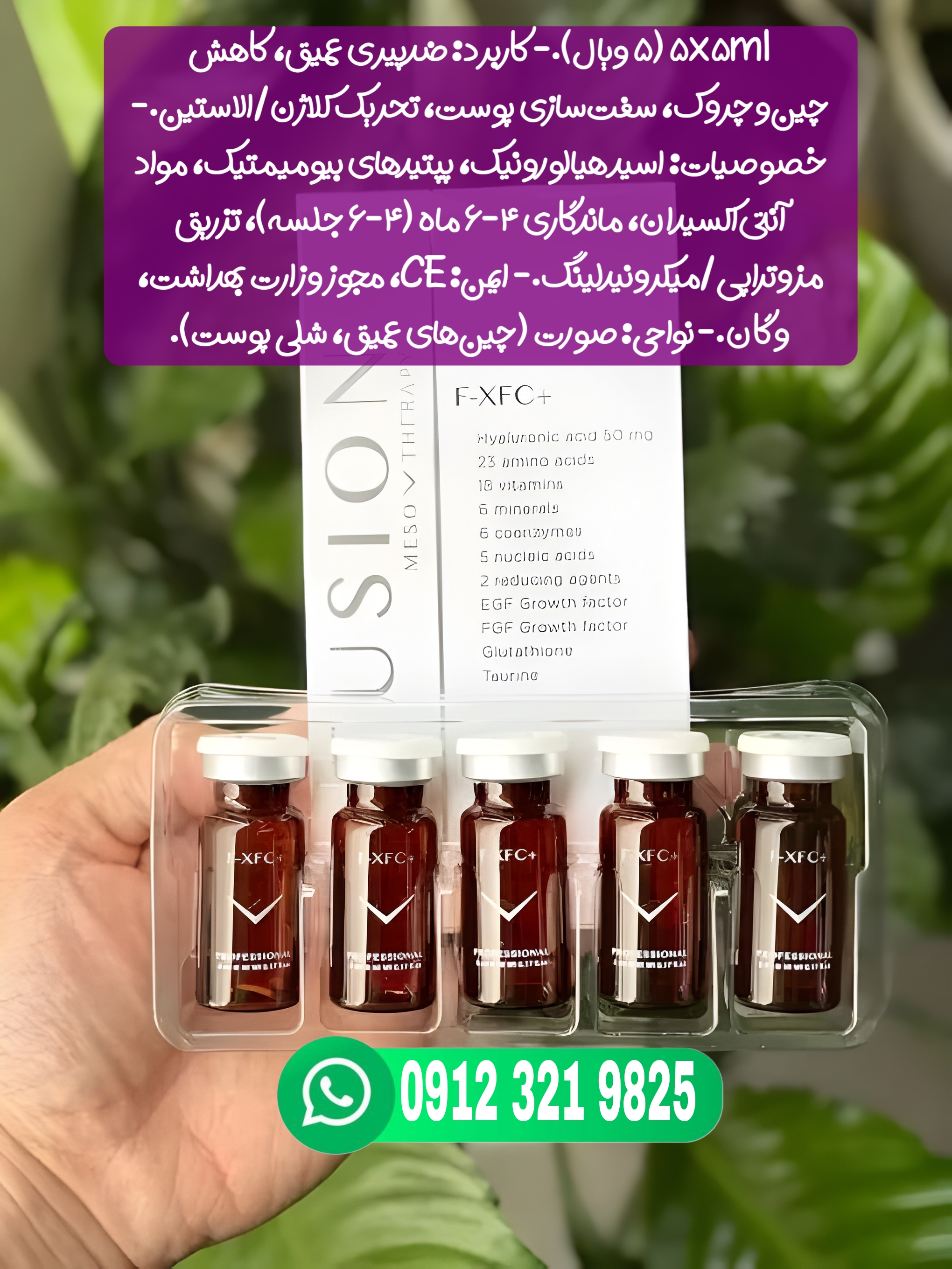 فیوژن XFC+ Fusion F-XFC+ ۵x۵ml، شاهکار اسپانیایی Fusion Meso برای ضدپیری عمیق و سفتی! با اسید هیالورونیک، پپتیدهای بیومیمتیک، و آنتیاکسیدانها، چینوچروک عمیق رو فوری کاهش میده – ماندگاری ۴-۶ ماه، تزریق مزوتراپی، نتایج طبیعی که رقبا رو نابود میکنه! مناسب کلینیکهای زیبایی تهران، اصل اسپانیا، CE، مجوز وزارت بهداشت – فیکها رو دور بنداز! ارسال فوری. Fusion F-XFC+ Original Spanish 5x5ml, Deep Anti-Aging & Firming Booster – Youth Restored! Bulk Deals, Free Demo. #فیوژن_XFC+ #ضدپیری_عمیق #FusionFXFC