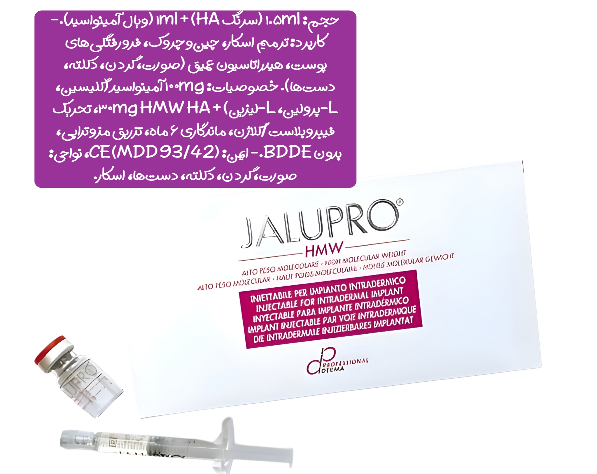- حجم: ۱.۵ml (سرنگ HA) + ۱ml (ویال آمینواسید).- کاربرد: ترمیم اسکار، چینوچروک، فرورفتگیهای پوست، هیدراتاسیون عمیق (صورت، گردن، دکلته، دستها).- خصوصیات: ۱۰۰mg آمینواسید (گلیسین، L-پرولین، L-لیزین) + ۳۰mg HMW HA، تحریک فیبروبلاست/کلاژن، ماندگاری ۶ ماه، تزریق مزوتراپی، بدون BDDE.- ایمن: CE (MDD 93/42)، مجوز وزارت بهداشت.- نواحی: صورت، گردن، دکلته، دستها، اسکار.