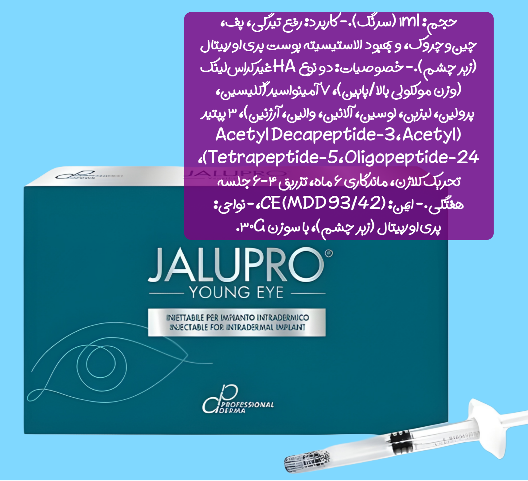 جالپرو یانگ آی Jalupro Young Eye ۱ml، شاهکار سوئیسی Professional Derma برای رفع تیرگی و پف زیر چشم! با دو نوع HA، ۷ آمینواسید، و ۳ پپتید، چینوچروک و الاستیسیته پریاوربیتال رو فوری بهبود میده – ماندگاری ۶ ماه، تزریق ۴-۶ جلسه هفتگی، نتایج طبیعی که رقبا رو نابود میکنه! مناسب کلینیکهای زیبایی تهران، اصل سوئیس، CE، مجوز وزارت بهداشت – فیکها رو دور بنداز! ارسال فوری، تخفیف ۱۵% تا ۳ روز. Jalupro Young Eye Original Swiss 1ml, Ultimate Under-Eye Revitalizer – Erase Dark Circles Instantly! Bulk Deals, Free Demo. #جالپرو_یانگ_آی #رفع_تیرگی_چشم #JaluproYoungEye